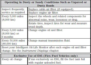 Engine air filter and cabin air filter replacement: Engine air filter and cabin air filter life are dependent on exposure to dusty and dirty conditions. Vehicles operated in these conditions require frequent inspection and replacement of the engine air filter and cabin air filter.