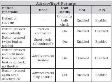 Some models may also come equipped with a sport mode which allows the driver to reduce normal AdvanceTrac® system intervention and provide a more spirited driving experience. To enter sport mode, press the stability control button twice rapidly with the brakes applied.