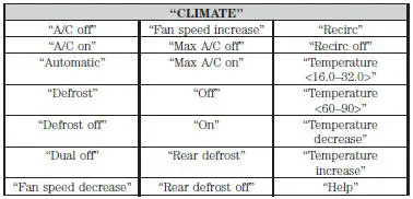 If you are not viewing the climate control screen, press the voice button and, after the tone, say “Climate”, then any of the commands in the following chart.